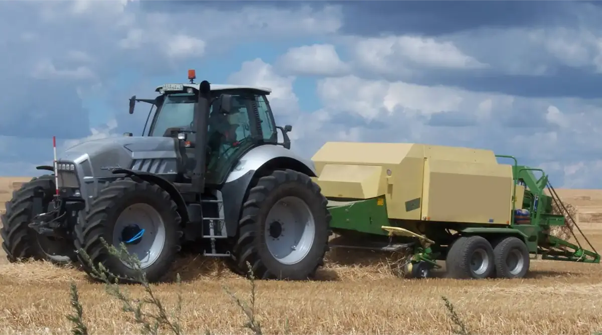 Le tracteur Lamborghini R8-265 est utilisé dans l’exploitation agricole du client pour le travail du sol (labour, hersage) et le transport de remorques avec diverses charges.