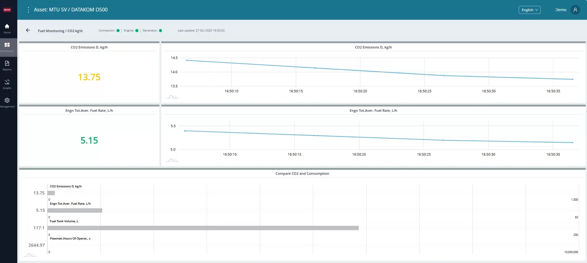 Direct measurement of fuel consumption in engine fuel lines provides high accuracy of CO₂ emission calculations and detailed breakdown by shifts, operations and operating conditions.