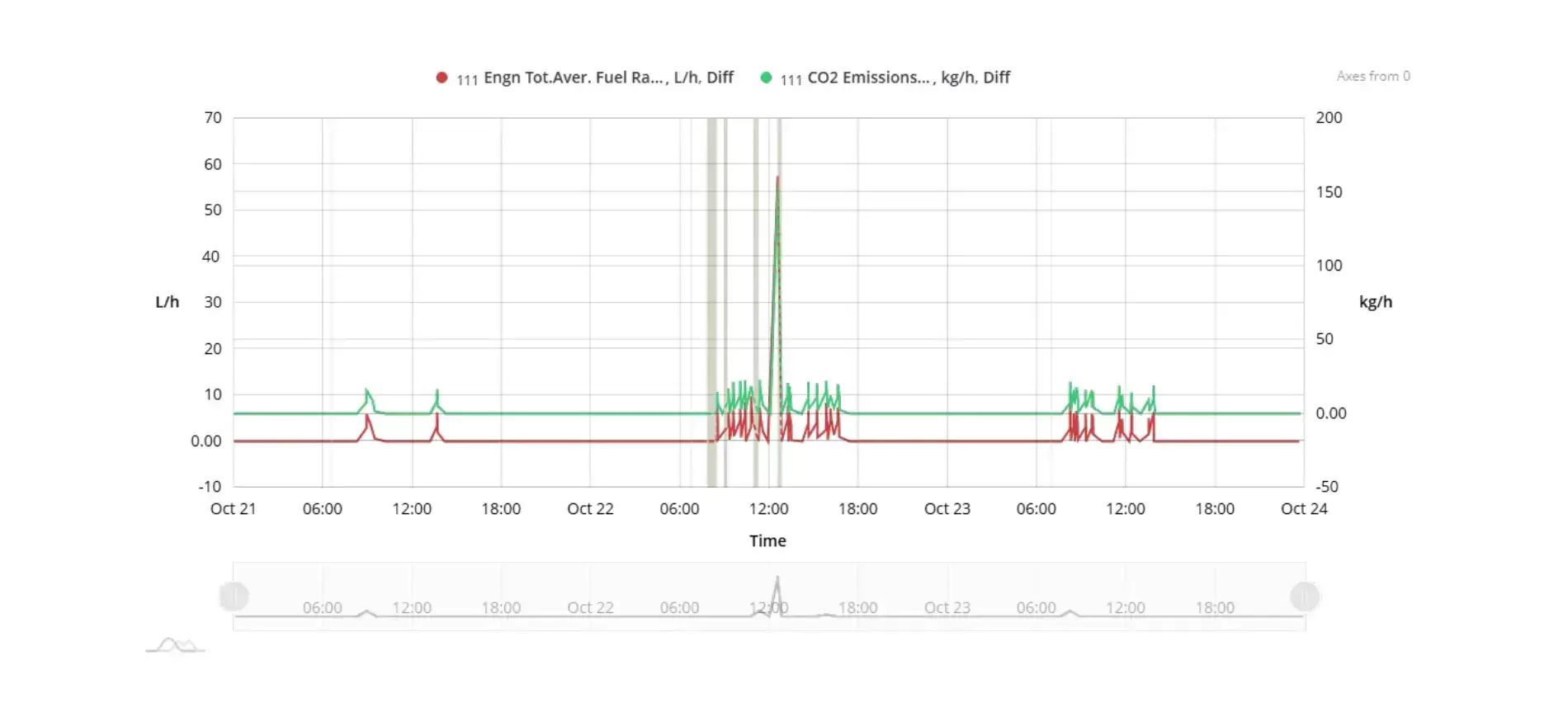 - Machine and shift reports – CO₂ emissions broken down by individual machines, trips and engine load modes (idle, optimal, overload).