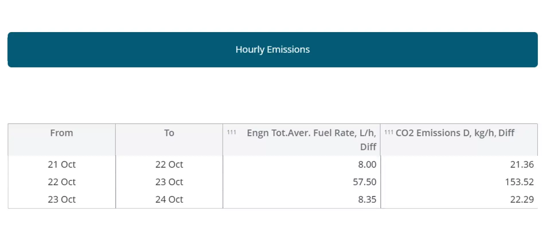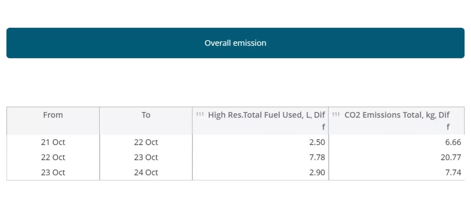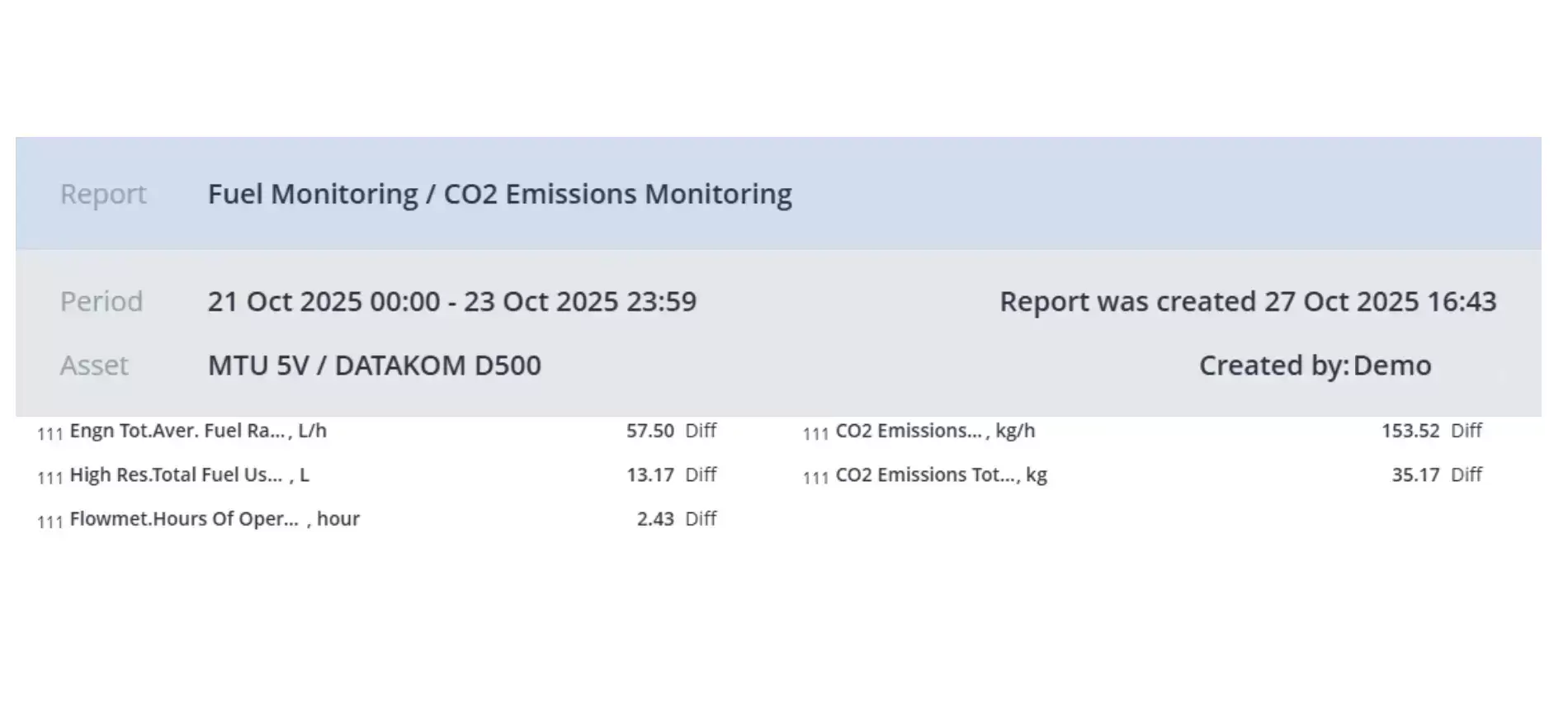 - Fleet summary report – fuel consumption, engine operating hours and CO₂ emission volume for the entire fleet over a selected period.
